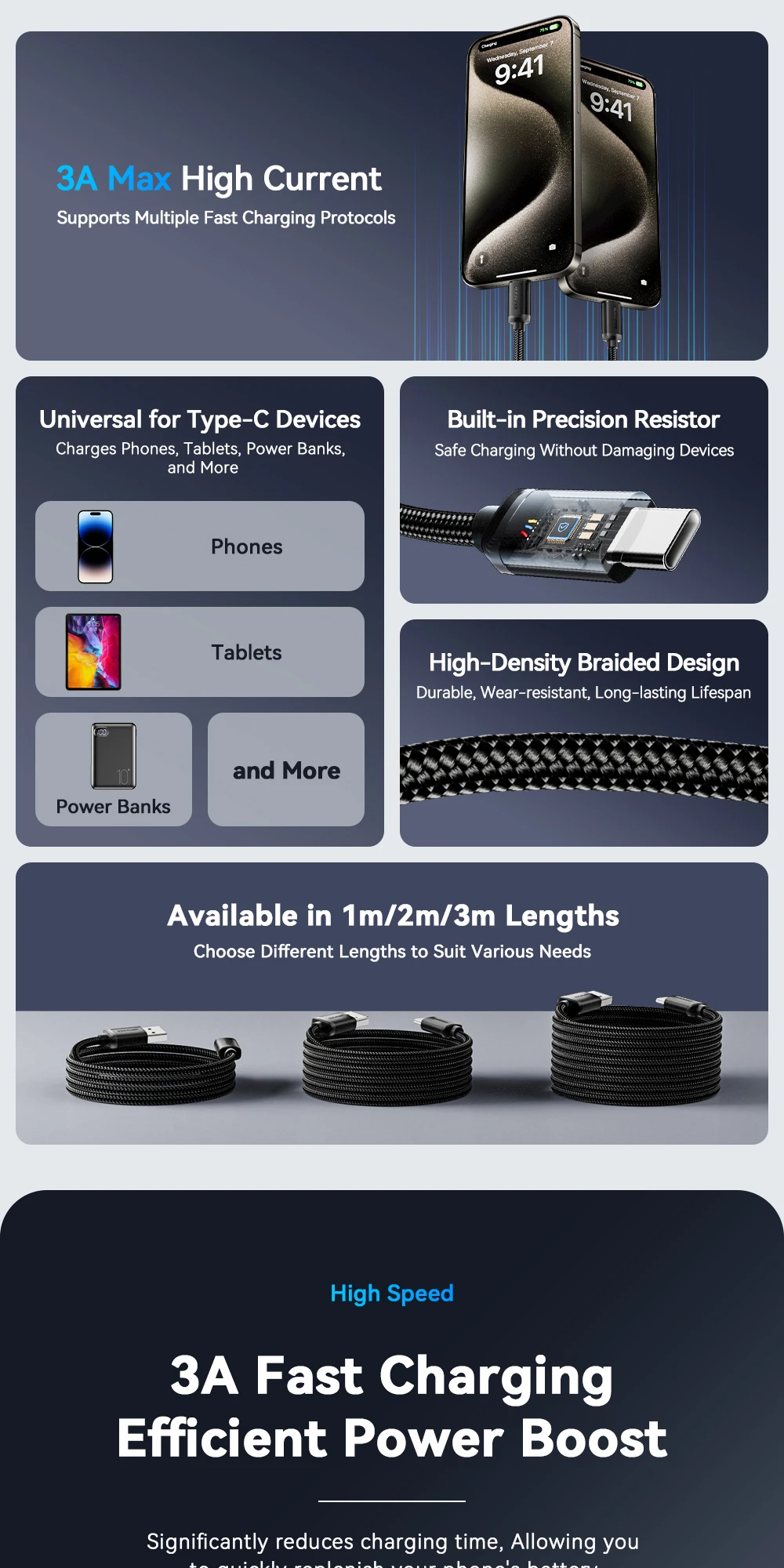 Ce câble est compatible avec une large gamme d’appareils, ce qui en fait un choix idéal pour tous. Que vous soyez à la maison, au bureau ou en déplacement, le Câble de Recharge USB 2.0 Type C Charge 3A s’adapte à tous vos besoins en connectivité.