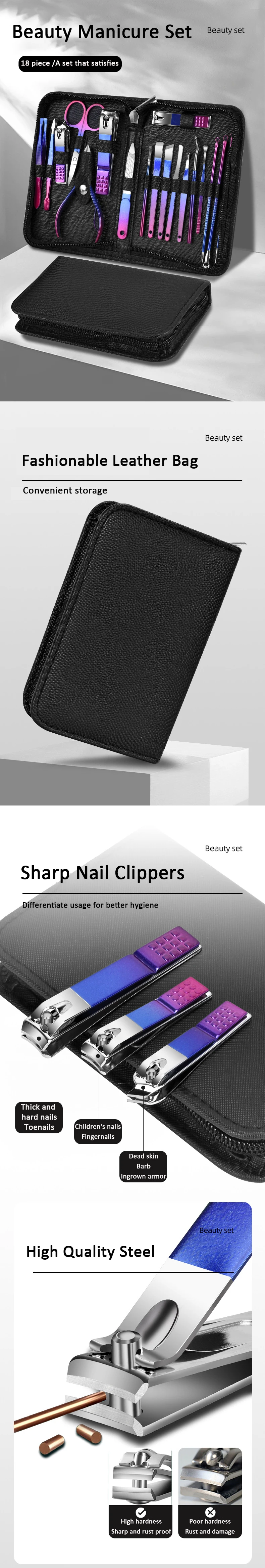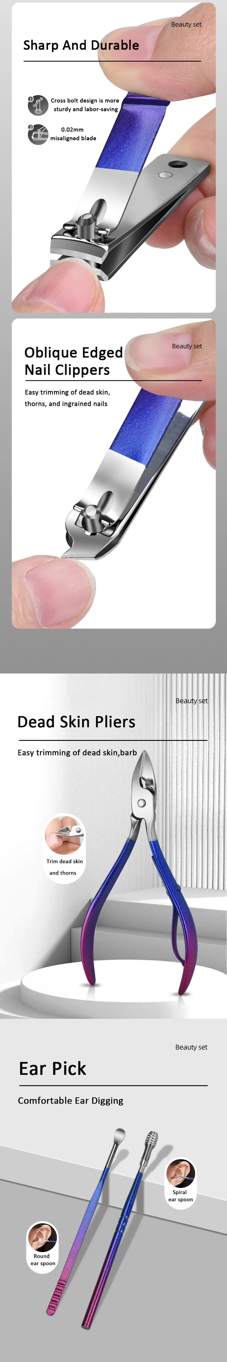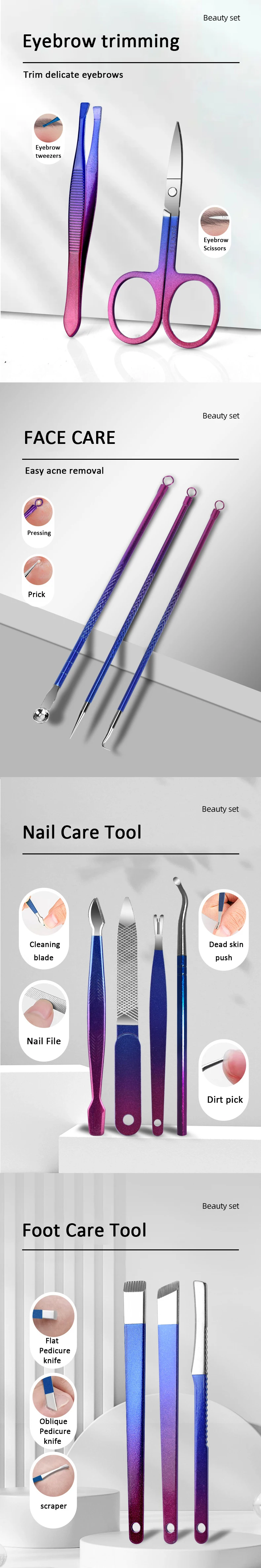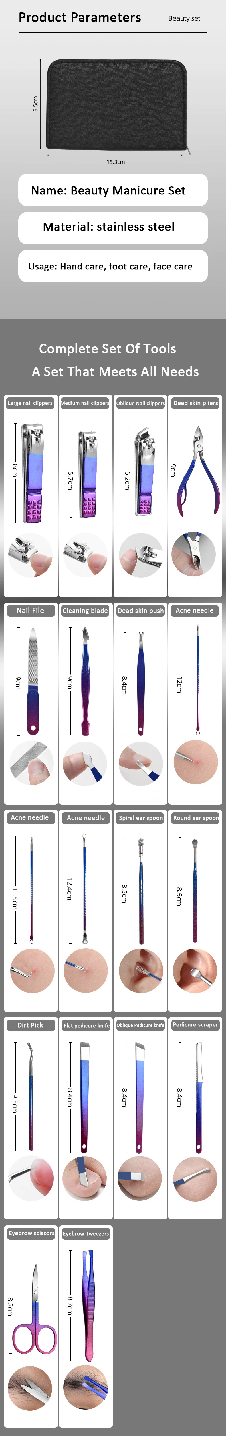 Set de manucure beauté : Cet ensemble complet d’outils répond à tous vos besoins en matière de soins des mains, des pieds et du visage. Fabriqué en acier inoxydable, il comprend divers outils pour un soin efficace et précis.