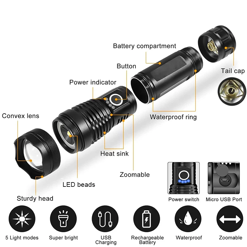 Lampe de poche tactique LED Rechargeable haute puissance, en alliage d'aluminium, Zoom télescopique, torche pour Camping en plein air et pêche