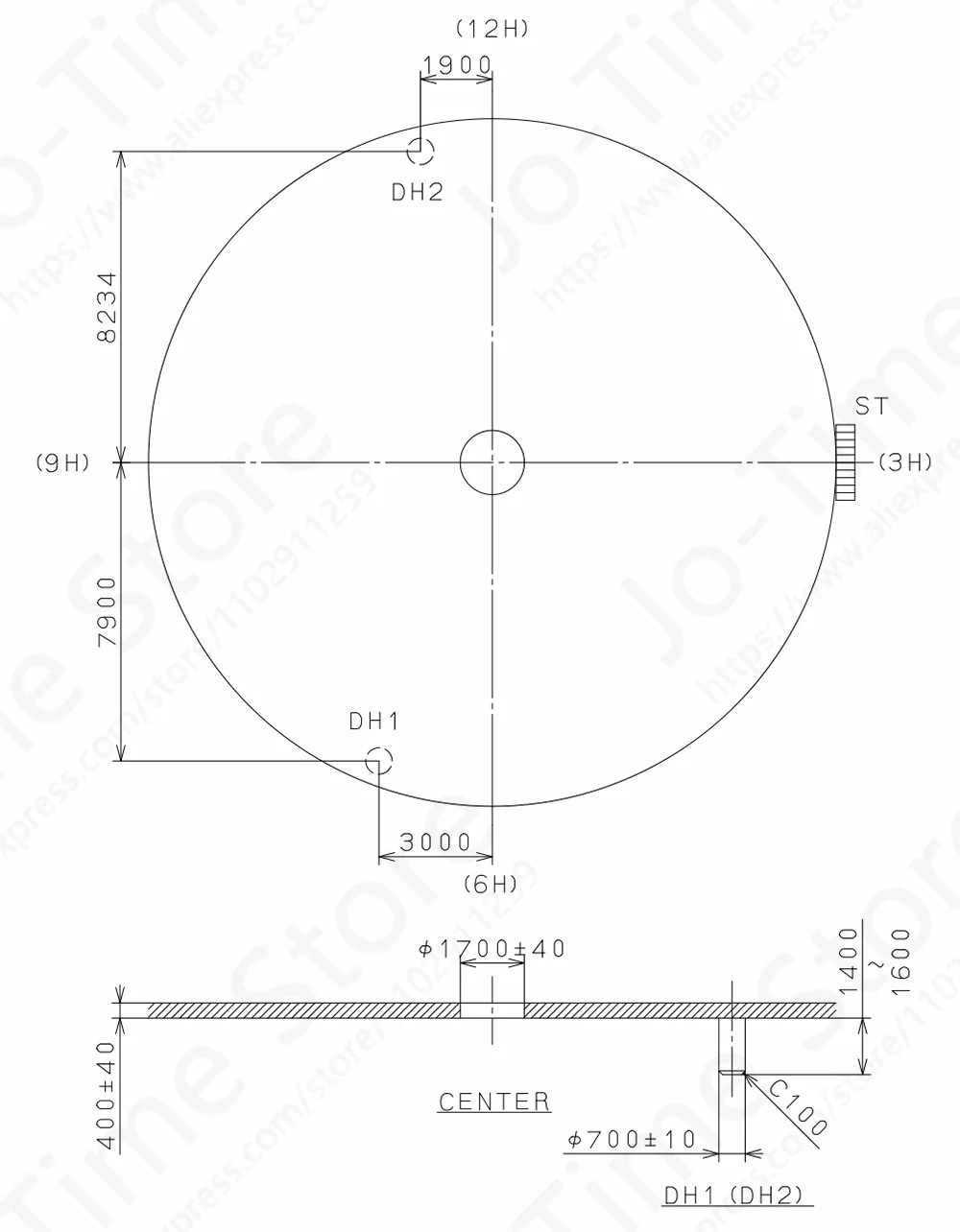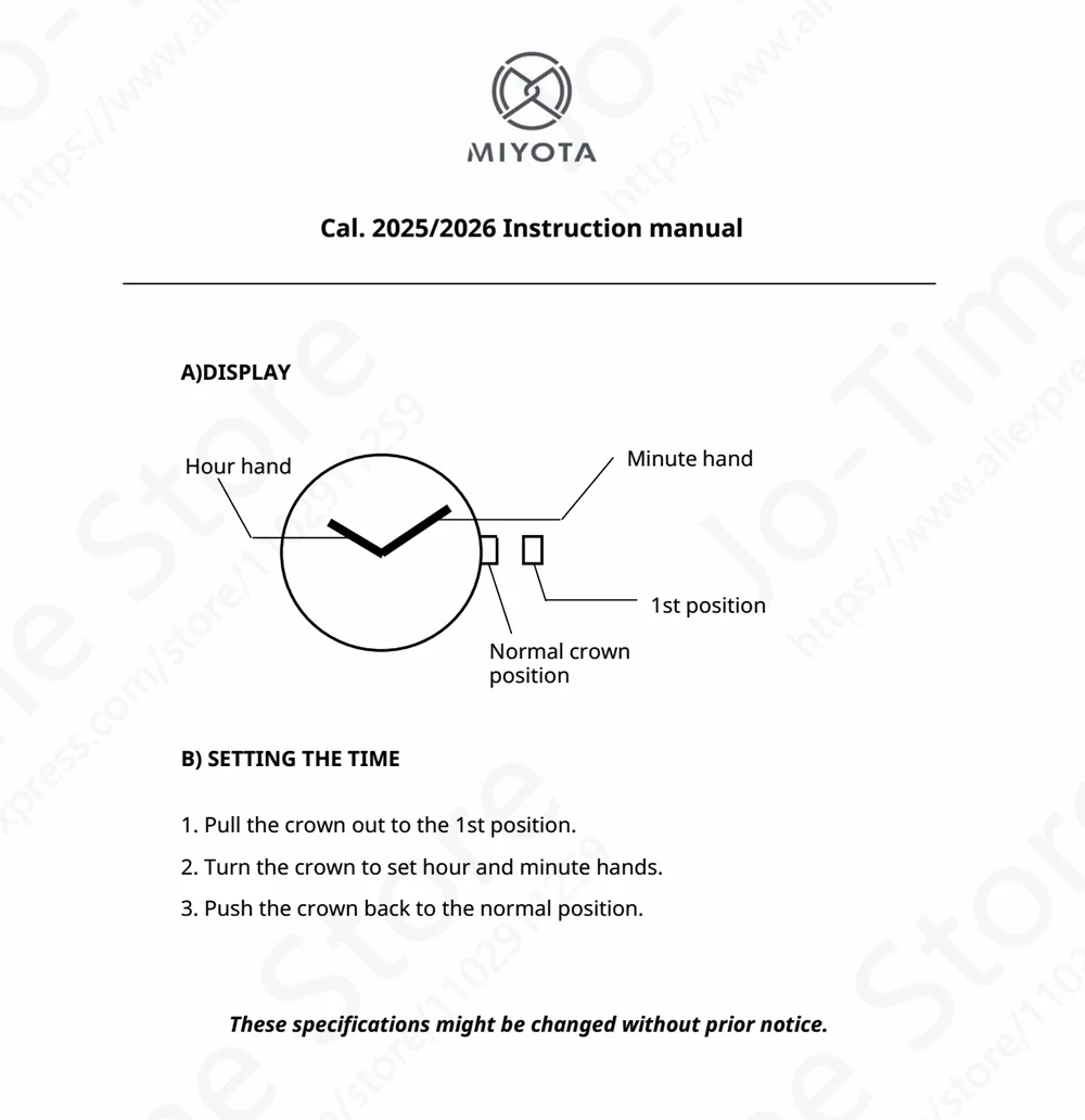 - Réglage de l’heure : tirer la couronne à la 1ère position pour ajuster les aiguilles.