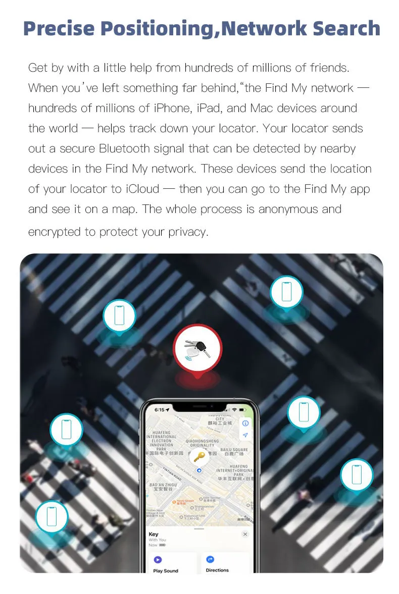 * Toutes les communications avec Find My Network sont anonymes et cryptées pour la confidentialité, les données de localisation et l\’historique ne sont jamais stockés sur Tag.